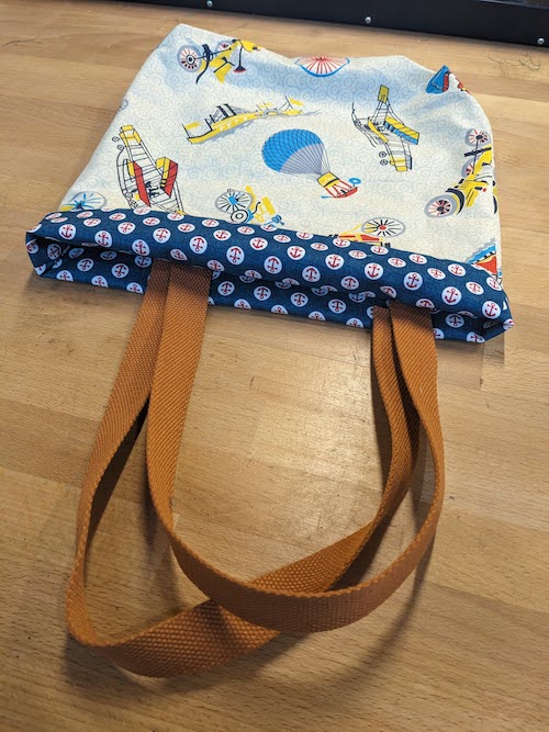 2024-05-01 Tote Bag 2. Reversible. Thinking about color and theme, I selected for transportation. Muted base with pops and dot pattern. Intro to Sewing Class