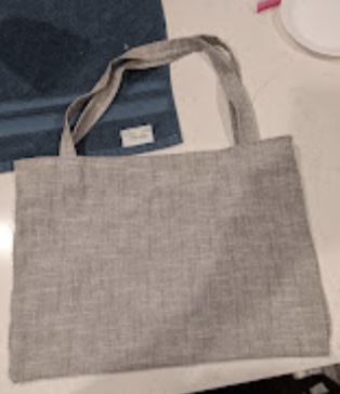 Tote bag 1. Got cheap fabric from goodwill table cloth. Functional. Ugly. Good first!!!