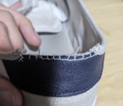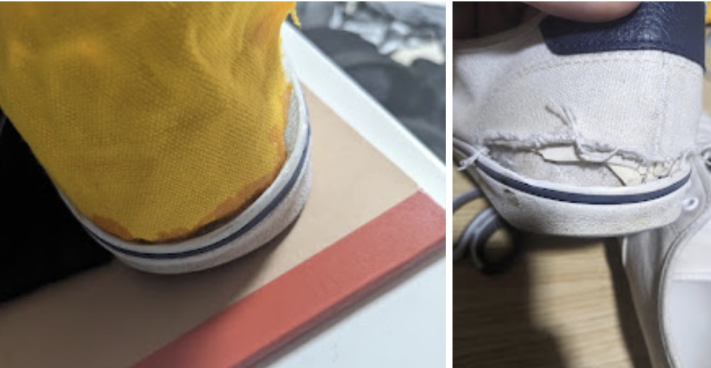 2024-09-09 Epoxy repair + added canvas patch on heel of left shoe and small reenforcement on part of shoe that has frayed on right. Would have preferred white, but could only find canvas in yellow. Better than no shoe!